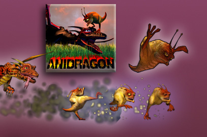 Real time infant and adult dragons - designed, modeled, textured, rigged and animated to a intuitive AI. Also, the dragon's food: squeebles.